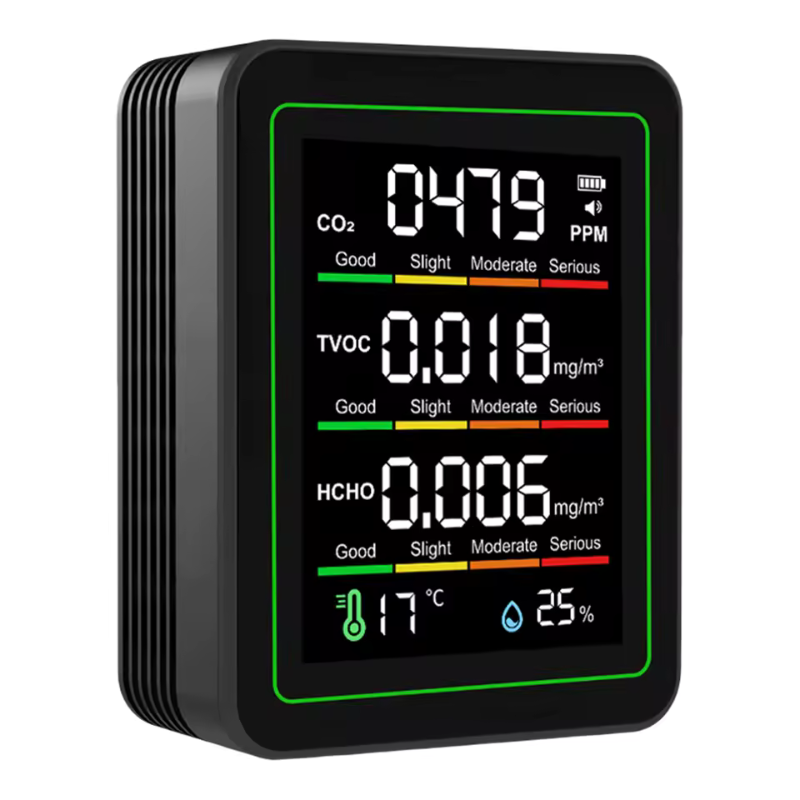 | 5 in 1 Indoor Air Quality Monitor CO2 TVOC HCHO Tester Temperature Humidity Detector Air Quality Detector for Home Office Features: 1.Smart Air Quality Monitoring: This indoor air quality monitor features a semiconductor TVOC sensor for precise measurement of CO2, formaldehyde, and volatile organic compounds, enhancing your living environment. 2.High Precision Detection: Equipped with a quality electrochemical module, this air quality tester offers excellent accuracy, stability, low interference, and energy efficiency. 3.Large Screen Display: The air quality detector's large screen displays battery level, CO2, temperature, humidity, and air quality indices, providing comprehensive environmental insights. 4.Easy Operation: With no need for calibration, turn on the air quality meter and instantly measure CO2 levels, simplifying use and ensuring convenience. 5.Enhanced Ventilation Design: Multiple vents promote efficient air exchange and cooling, aiding in accurate and quick environmental assessments. Specification: Origin: Mainland China Tips: This product uses a semiconductor sensor with high sensitivity. But it can only detect, the data will not be very accurate (called qualitative but not quantitative), it can only detect mixed carbon dioxide, such as carbon dioxide exhaled by the human body, and cannot detect pure carbon dioxide C02 indicator: 0-799PPM: pointing to green light 800-1199PPM: pointing to yellow light 1200-1599PPM: pointing to orange light 1600PPM and above: pointing to red light Parameters: CO2 measurement range: 400-5000ppm CO2 measurement accuracy: ±150PPM Temperature measurement range: 0-50°C Temperature measurement accuracy: ±1°C Humidity measurement range: 0%-99%RH Humidity measurement accuracy: ±2%RH HCHO: 0-1.999mg/m³ TVOC: 0 -9.99mg/m³ Screen size: 2.8 inches Screen type: TFT-LCD Screen material: glass Casing material: ABS Screen resolution: 240*240 Response time: <1s Working voltage: 5V/1A Adapter charging (Type-C interface) Maximum power: Charging current 600mA 3.7V lithium battery power supply Battery capacity: 1200mAh Full charge usage time: 30H (max) Battery type: lithium battery Charging method: USB Charging time: about 2-3 hours Product size: about 90.00x70.00x35.00mm/3.54x2.76x1.38inch Note: