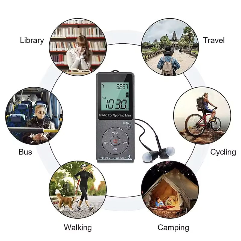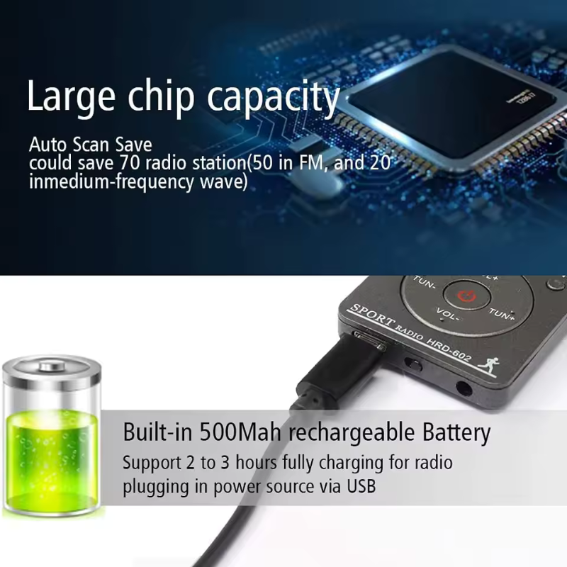 [Portable AM/FM Digital Radio]Pocket portable radio, have high sensitivity reception. Supports AM/FM 2 band stereo radio. FM frequency rangs:60-108KHZ, AM frequency rangs: 9KHZ: 522-1620KHZ /10KHZ:520-1710KHZ. Can store 70 radio stations (50 in FM, and 20 inmedium-frequency wave) [Sport radio with pedometer]This is a sports radio with built-in Pedometer Function, can record your steps, stride length, calories burned by exercise, and distance. Highly portable, putting it in your pocket will not bring you any burden, it is the best partner for sports. [Rechargeable battery]This walkman radio has a built-in 400MAH lithium battery, which has a long battery life and does not require frequent battery replacement, just use the attached USB to charge it. You can judge whether the power level is sufficient according to the battery symbol on the LCD screen. [Multifunctional pocket radio]Fully automatic search and storage of radio stations/rechargeable/step counter/calorie consumption record/calculation of walking distance/key lock design to avoid misoperation/sleep timer and clock function.10-90 mins sleep time can be set in this Mini radio. You can enjoy the radio time before going to bed. [Best Gift]This Personal Mini Radio is easy to carry because it is light enough. Whether it is sports, travel, walking, walk the dog, or cycling, it is very suitable. It can also be used as a perfect gift for parents, children, friends. Material:ABS colour:Silver gray Package Contents: 1 * Radio 1 * Storage Bag 1 * Lanyard 1 * Usb Charging Cable 1 Pair * Headphones(Random color, don't accept the specified color) Only the above package content, other products are not included. Note: Light shooting and different displays may cause the color of the item in the picture a little different from the real thing. The measurement allowed error is +/- 1-3cm.