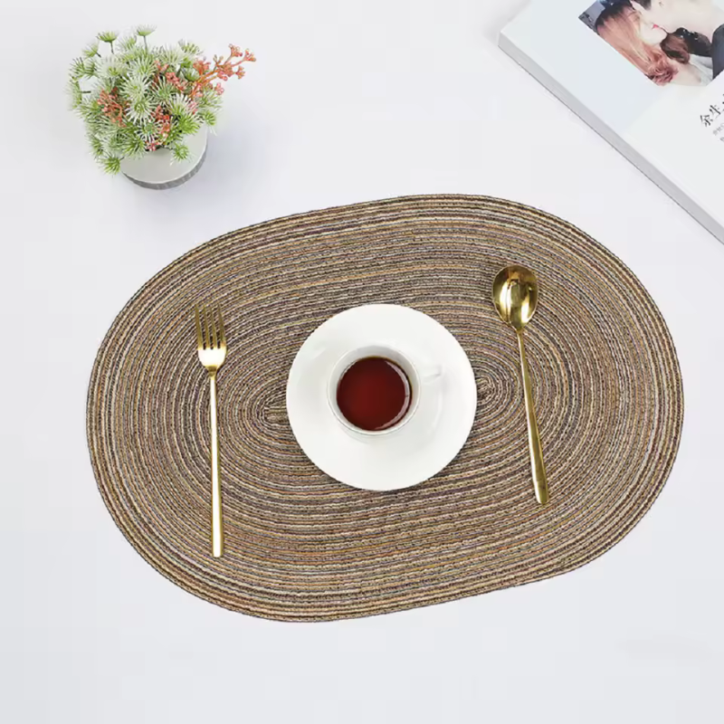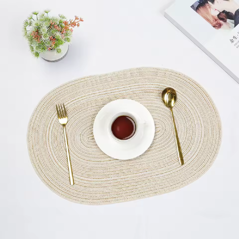 made by 100% high quality eco polyester material. hand-made braided placemats. natural, durable, washable. Available in sets of 1/4/6/10