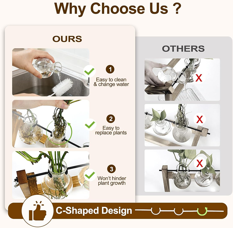 Unique Planter Design: Say goodbye to complicated installation! In just a few minutes, you can have a propagation station set up and ready to use. A c-shaped metal frame provides convenience for watering and replacing plants
