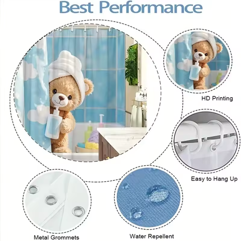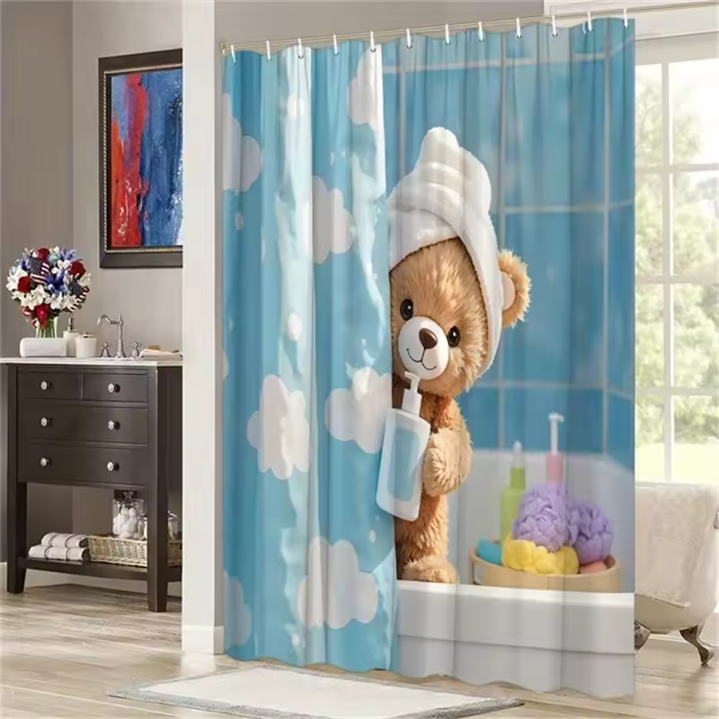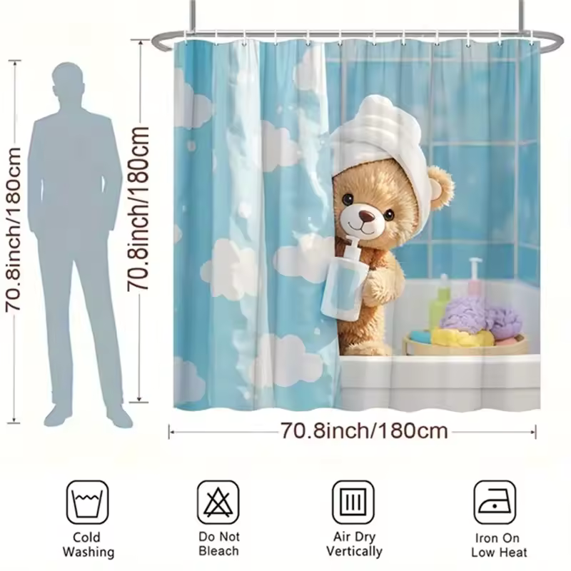 Teddy Bear Shower Curtain - Plush Bear & Towel Design, Blue Clouds, Polyester, 12 Hooks, 70.8x70.8 Inches, Washable