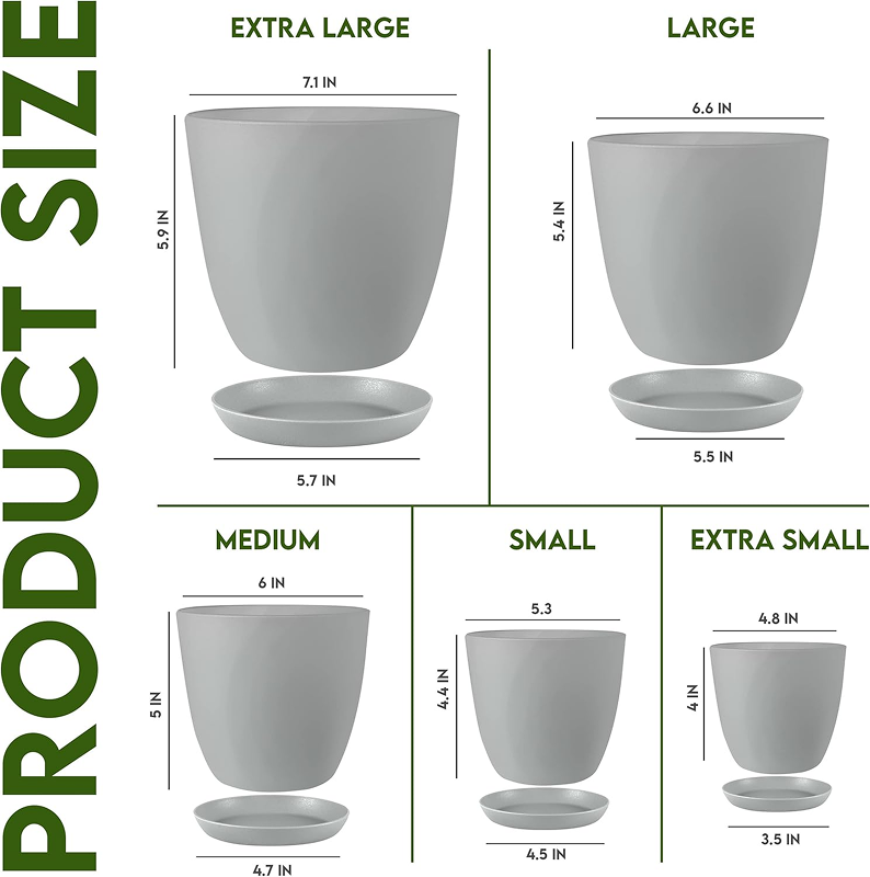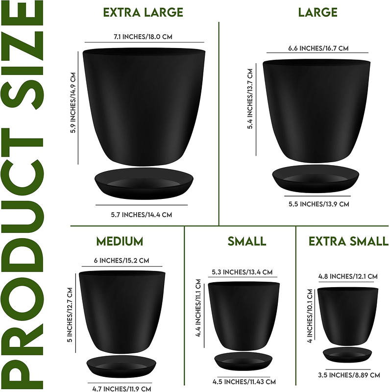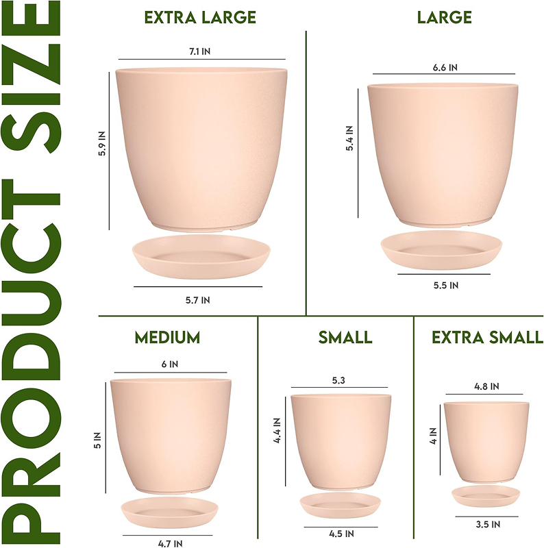 • Multiple Sizes – This nursery plant pots indoor comprises multi-size pots – Extra Large (7” W x 5.9” H), Large (6.6” W x 5.4” H), Medium (6” W x 5” H), Small (5.3” W x 4.4” H), and Extra Small 4.8”W x 4” H. Also comprises of matching saucers.
